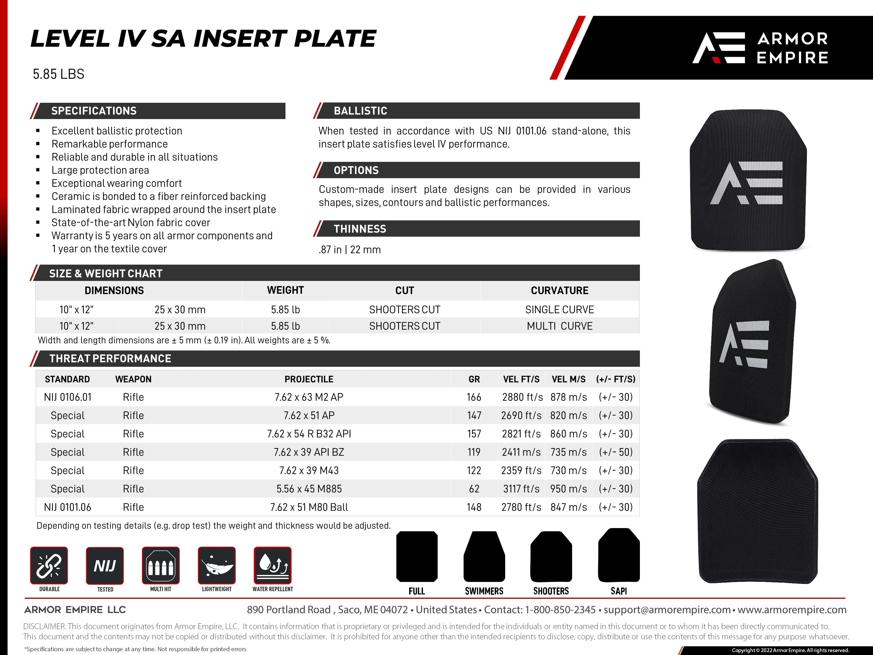 The Level IV stand-alone insert plate will stop lesser threats as well as the ones listed here.